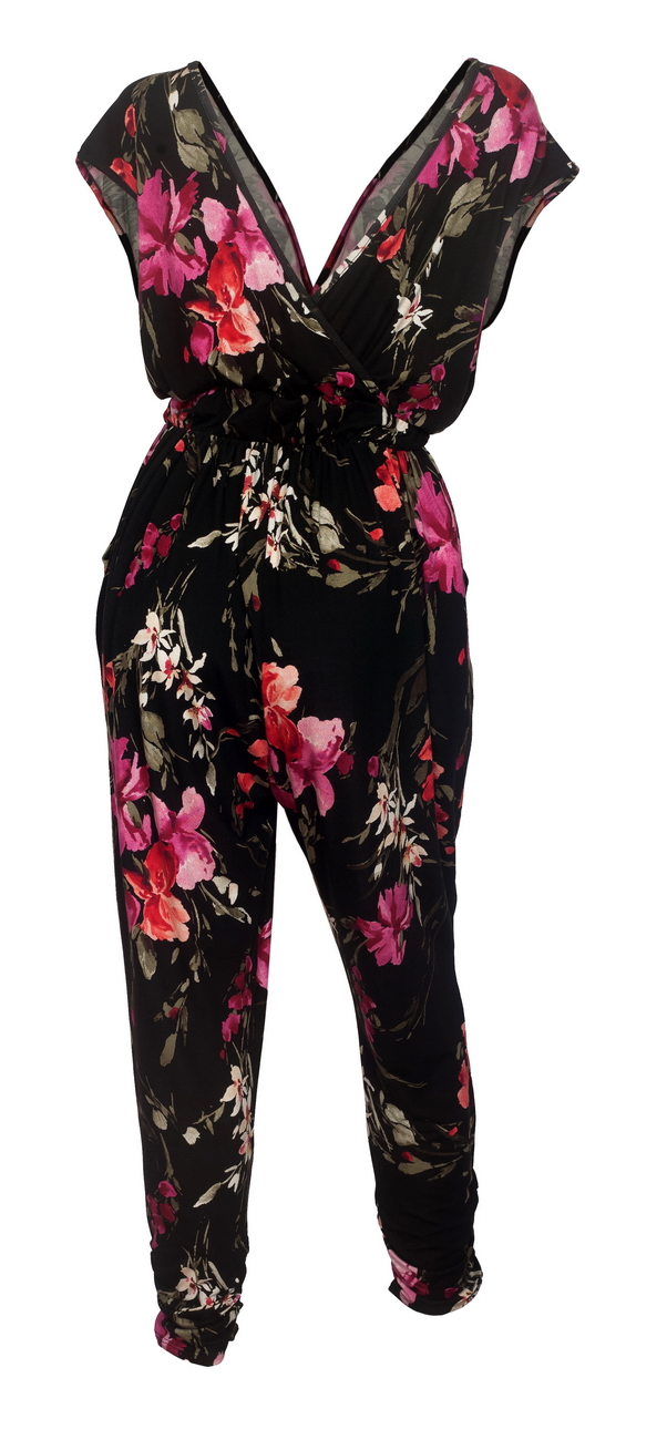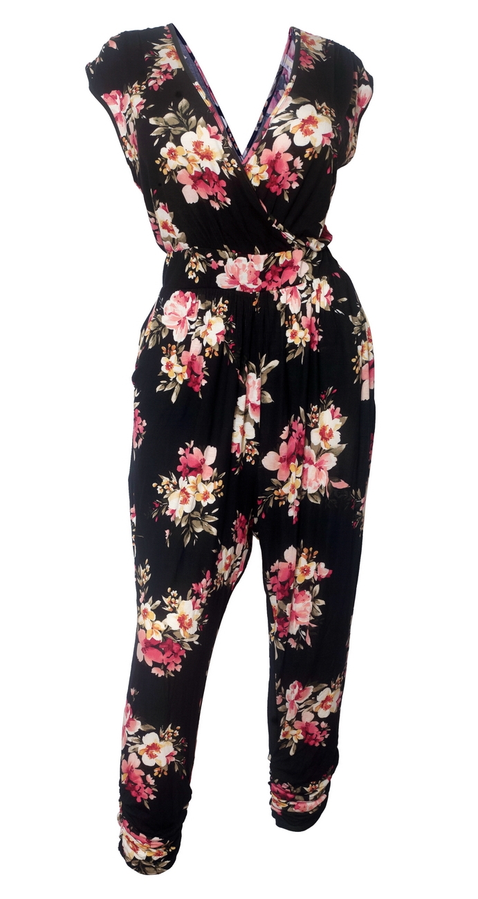 Plus Size Deep V-Neck Jumpsuit Black Floral Print 191123B